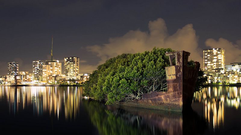 Точно неизвестно, почему старичок оказался брошен в бухте ввиду Сиднея, но факт остается фактом — груда металлолома за более чем 70 лет превратилась в плавучий тропический лес, любимый падкими к экзотике туристами.