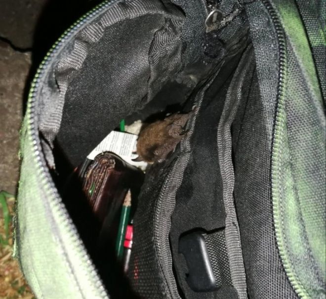 Когда открыл сумку и обнаружил сюрприз – спящую летучую мышь.