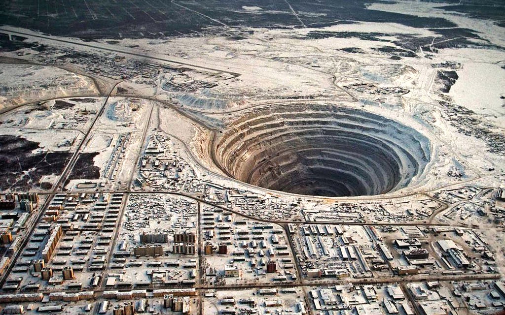 Гигантская «дыра», расположенная около города Мирный (Якутия), на первый взгляд похожа на метеоритный кратер, однако в действительности это «Мир» — один из крупнейших в мире алмазных карьеров.