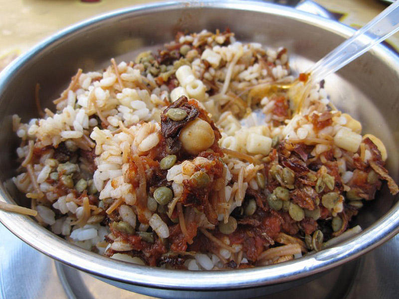 Египет: порцию koshary plate, которая включает рис, макароны, жареный лук, чечевицу, а также пончик или фаляфель.