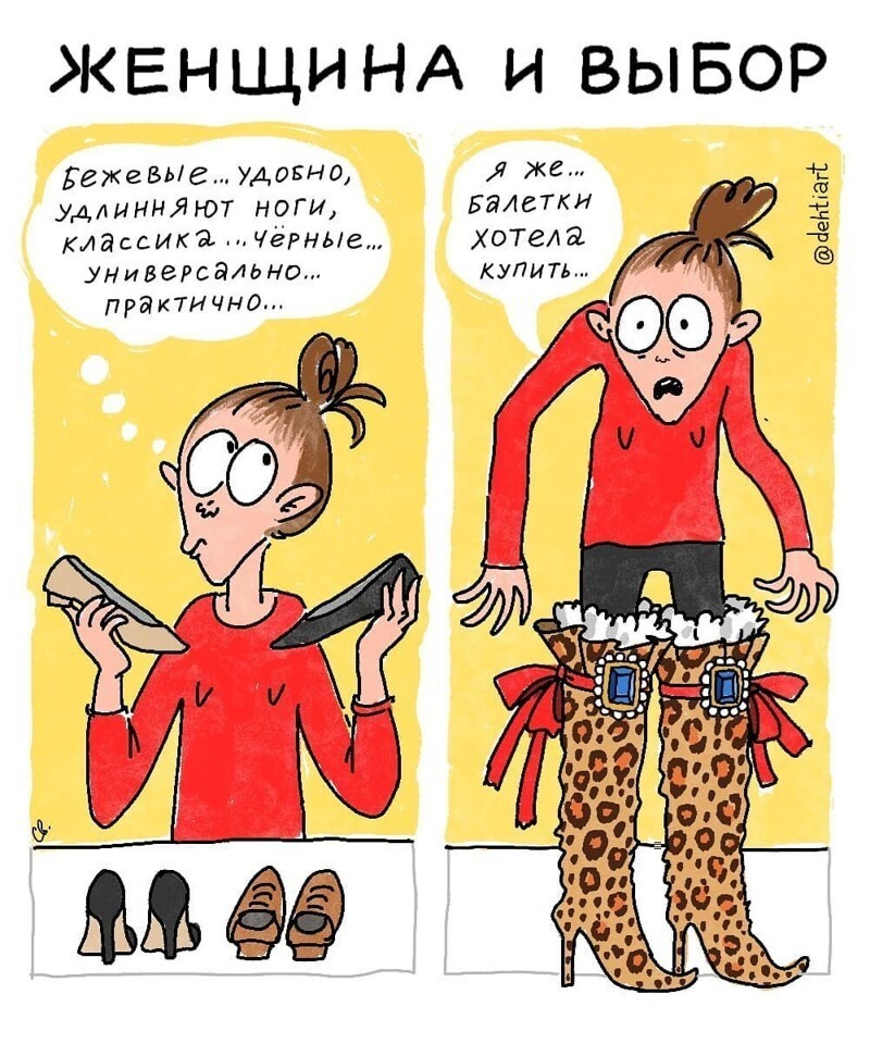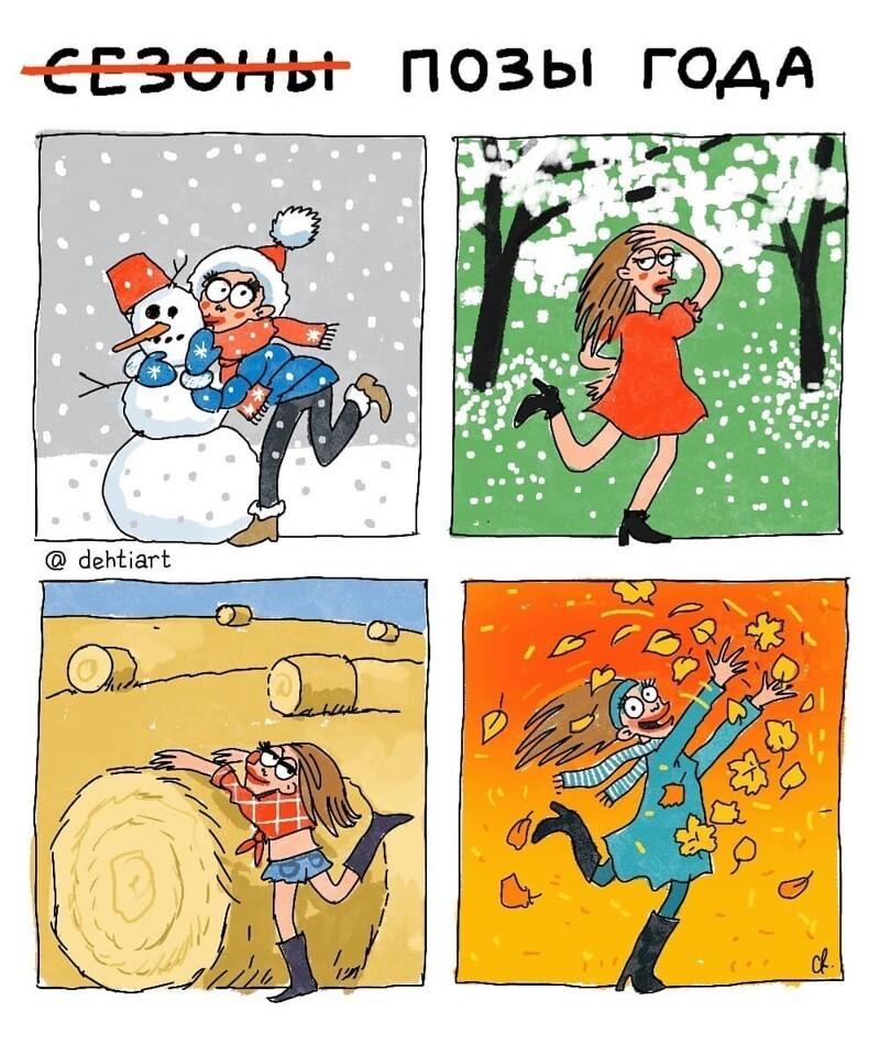 Художница из Санкт-Петербурга с ником «dehtiart» (в инстаграме) создает забавные и актуальные комиксы на волнующие ее темы. Она сравнивает, как в мире было раньше и что стало сейчас, смеется над девчачьими трудностями, а также немного показывает свою жизнь.