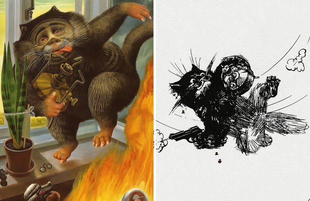— Вызываю на дуэль! — проорал кот, пролетая над головами на качающейся люстре, и тут опять в лапах у него оказался браунинг, а примус он пристроил между ветвями люстры. Кот прицелился и, летая, как маятник, над головами пришедших, открыл по ним стрельбу.