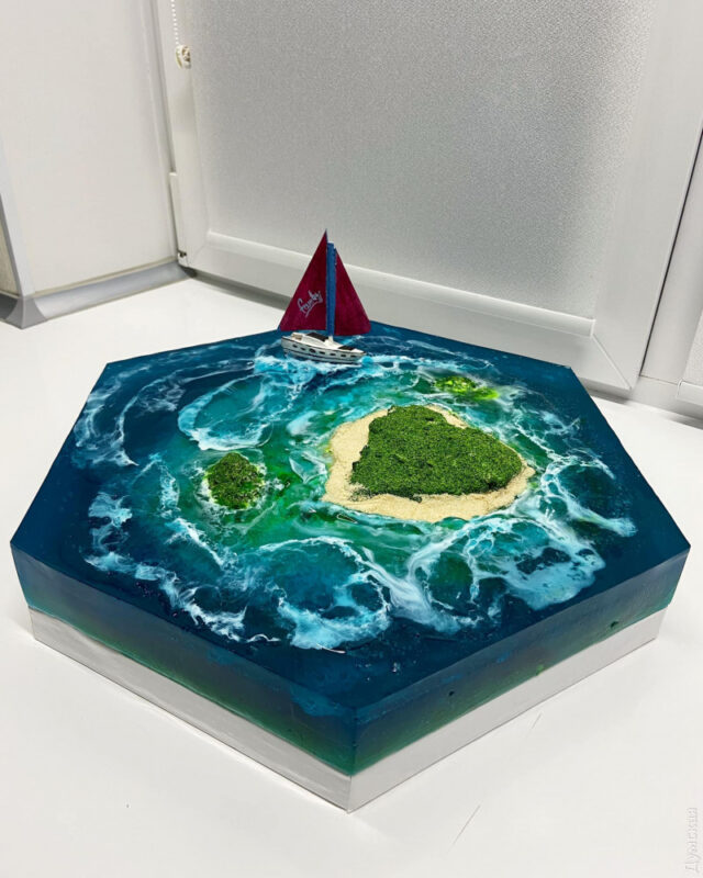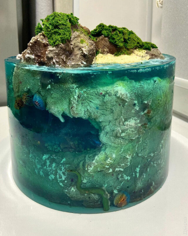 Подводный мир с кораллами и морскими жителями, бушующий океан с реалистичными барашками на волнах, друза кристаллов аметиста из цветной карамели… Даже не верится, что все это съедобно и создано руками мастера, у которого даже нет кулинарного образования.