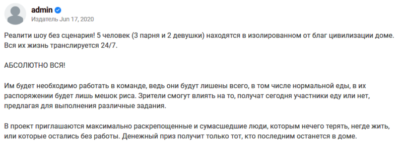 Вскоре выяснилось, что любители шоу оказались правы — на видео действительно участники шоу SosedTV от Александра Тимарцева, известного в сети также как Ресторатор. Автор описывает свой новый проект как «трешачок» о том, как отмороженные ребята живут под надзором видеокамер в пустом и холодном доме. Незатейливая жизнь 3 парней и 3 девушек транслируется в виде 24-часового стрима в интернете.