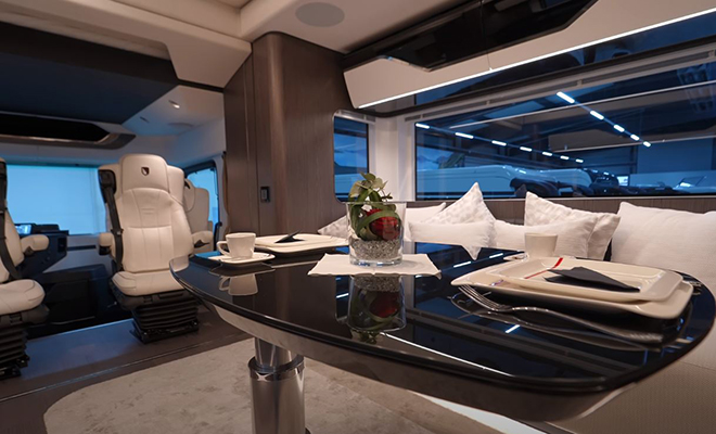 Автодом оснащен гаражом в заднем отсеке, внутри отдельно выделены хозяйская спальня и душевой отсек. В кабине расположены сразу четыре сиденья, два из которых поворачиваются в салон и становятся частью гостиной.