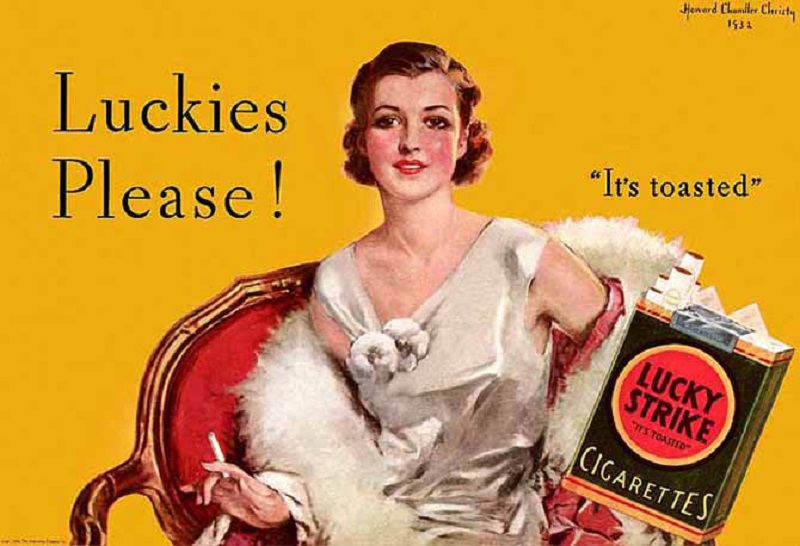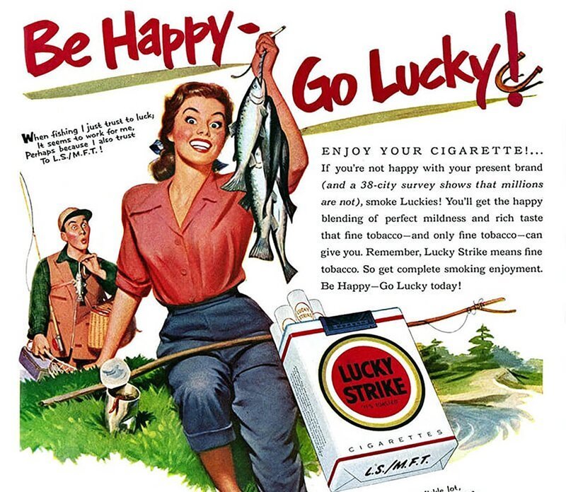 Курение сигарет Lucky Strike преподносилось не только как красивый и элегантный, но и полезный процесс. Рекламные плакаты утверждали, что табак способствует похудению и улучшает зубы. Согласно их убеждениям дым убивал во рту вредные микробы. Для закрепления мнения в массовом сознании был придуман лозунг: «Выбери Лаки, а не сласти».